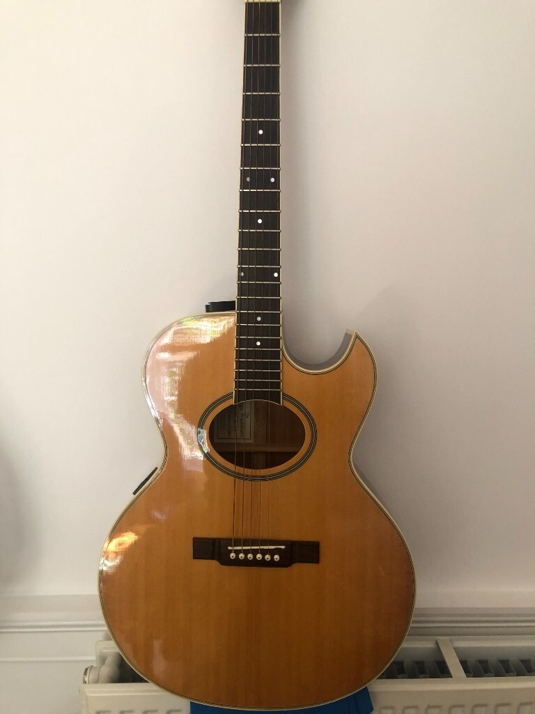 This was my first guitar, so sad to see it go but been sitting unused for seenew washburn electro acoustic guitar maghony neck,back and sides maghony fretboard spruce top barcus berry pre amp and pickup ans built in tuner.