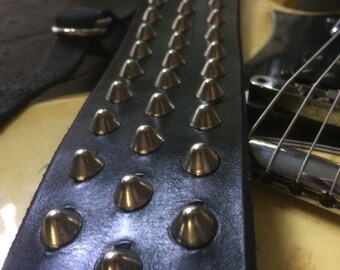 Current 50+ Studded Acoustic Guitar Strap. When choosing an acoustic guitar strap you need to know how you prefer it hanging if you aren't sure just opt for something with a button adapter or at you could go for a wooden beaded strap, or even a military style ammo belt or studded spikes. Most of the time, there are two strap buttons which can easily work with generic guitar straps, but there are some guitars that have less than two strap buttons which require adapters or specialized lace that wrap around the headstock. Leather black with maltese cross conchos and studs bass, acoustic guitar strap. Black genuine leather with strong metal fastener;