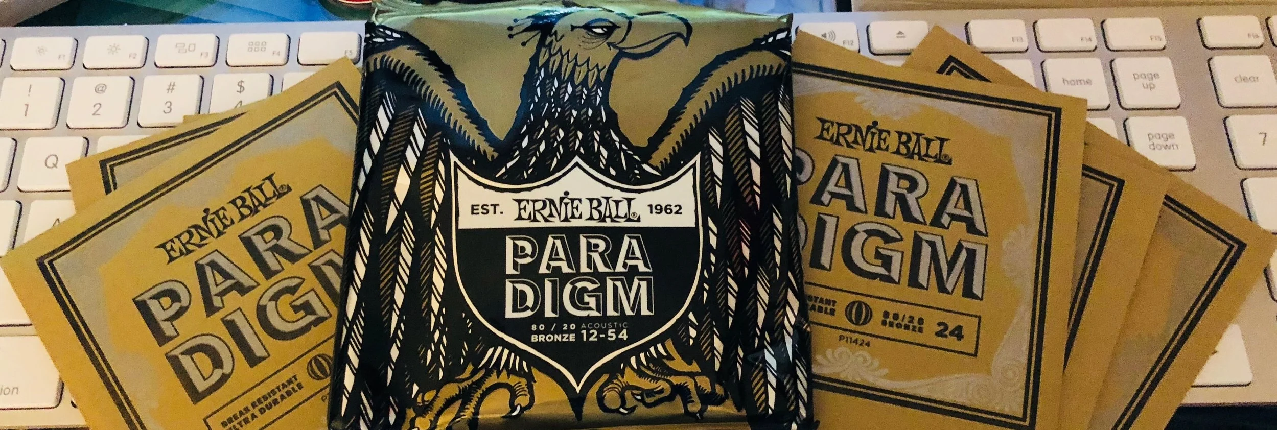 New 43++ Paradigm Acoustic Guitar Strings. Paradigm acoustic strings provide unprecedented strength and longer string life while retaining 100% earthwood tone and feel. These 80/20 bronze strings deliver vivid tone along with advanced engineering that can withstand aggressive players. Paradigm acoustic sets are one of the most break resistant strings. Ernie ball paradigm strings review.